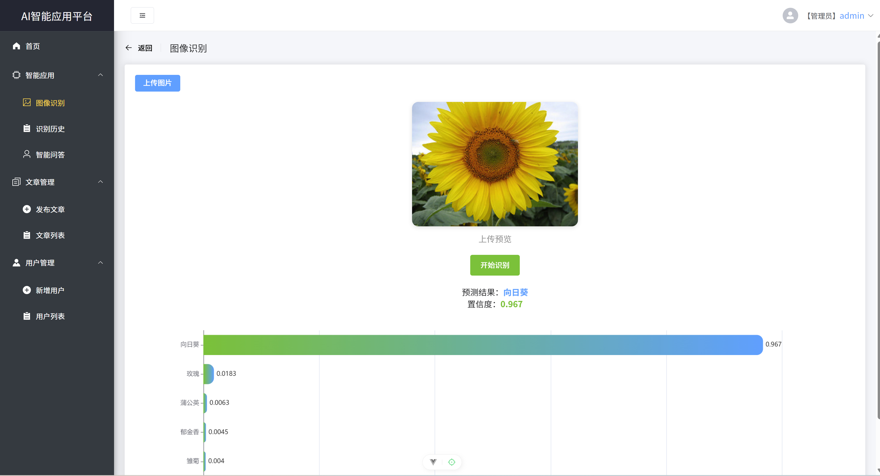 - 在图像识别功能中,用户上传图片后,点击识别,可输出其识别结果和置信度