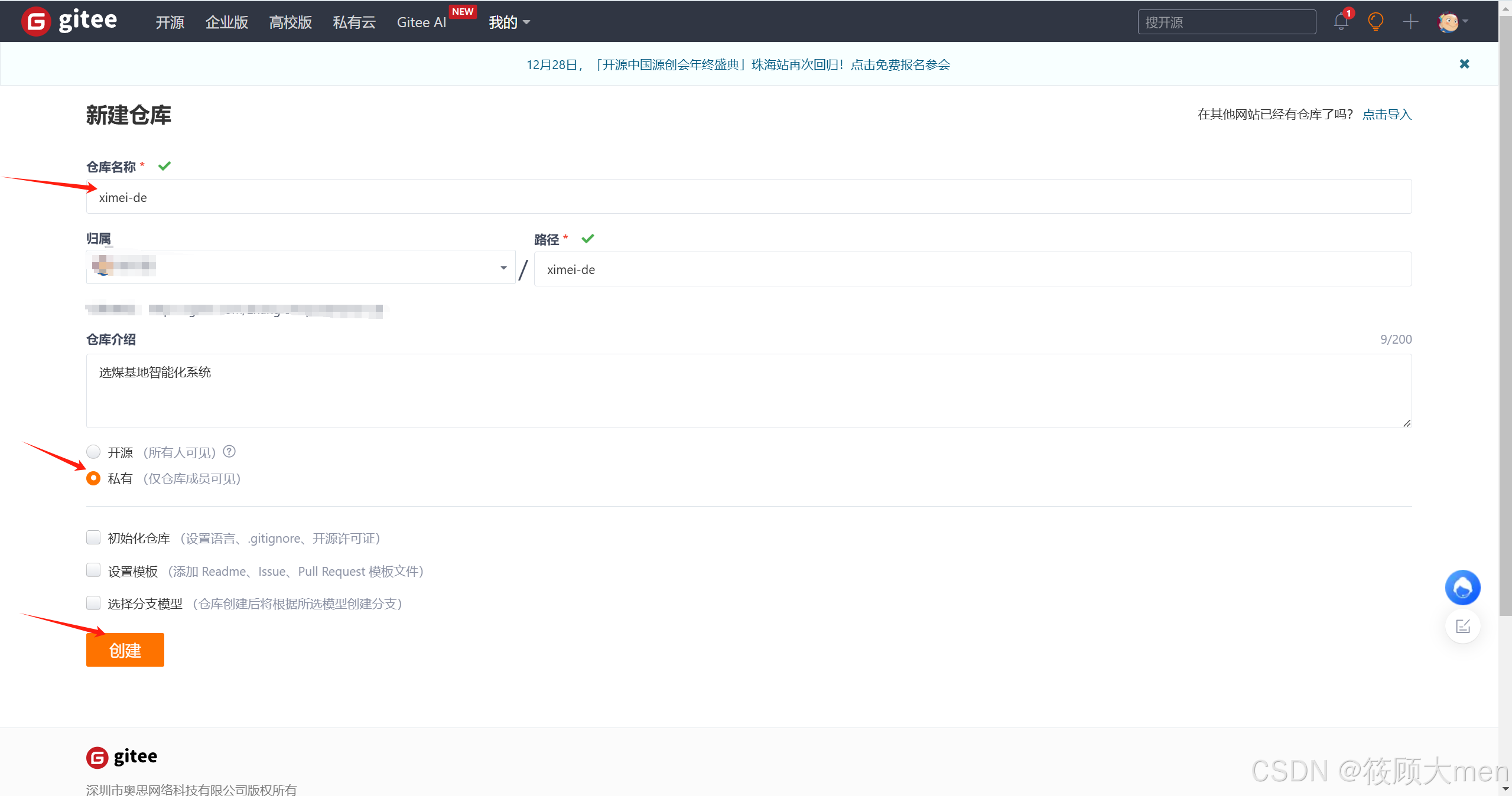这样创建一个仓库,私有和开源,根据自己选择
