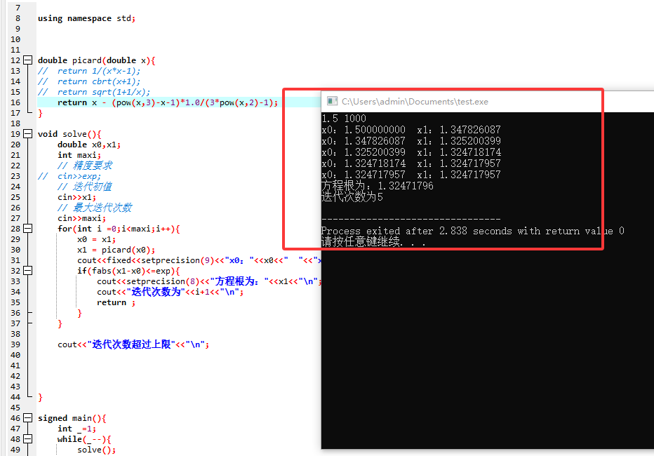 cout<<setprecision(8)<<"方程根为:"<<x1<<"\n";