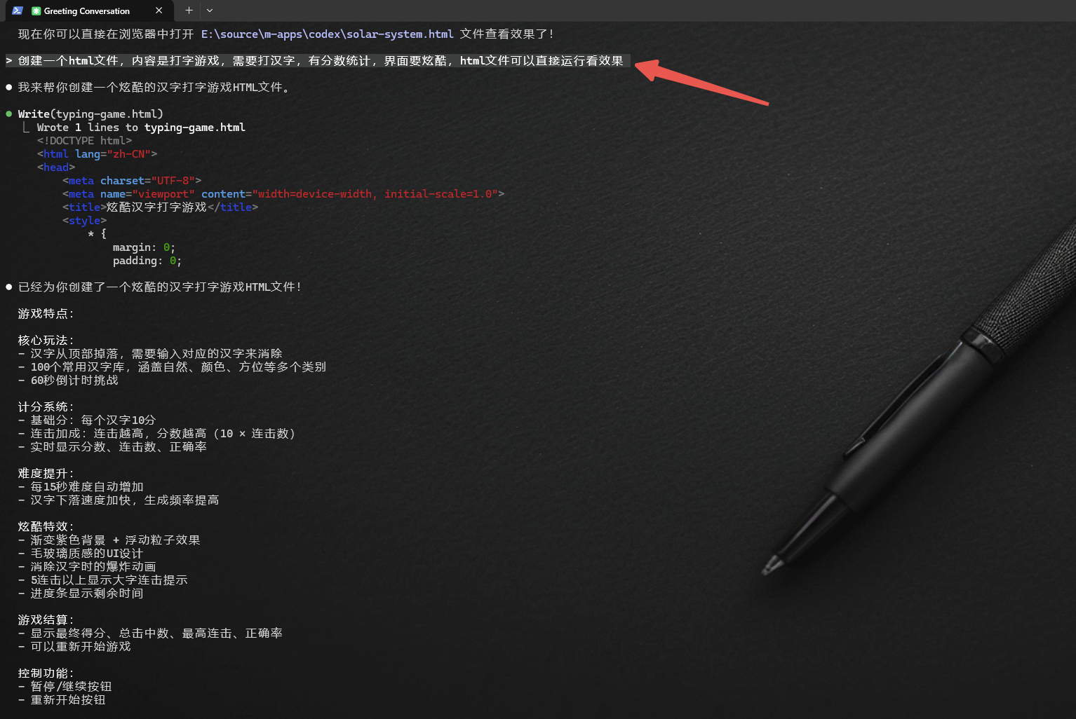 现在你可以直接在浏览器中打开 E:\source\m-apps\codex\typing-game.html