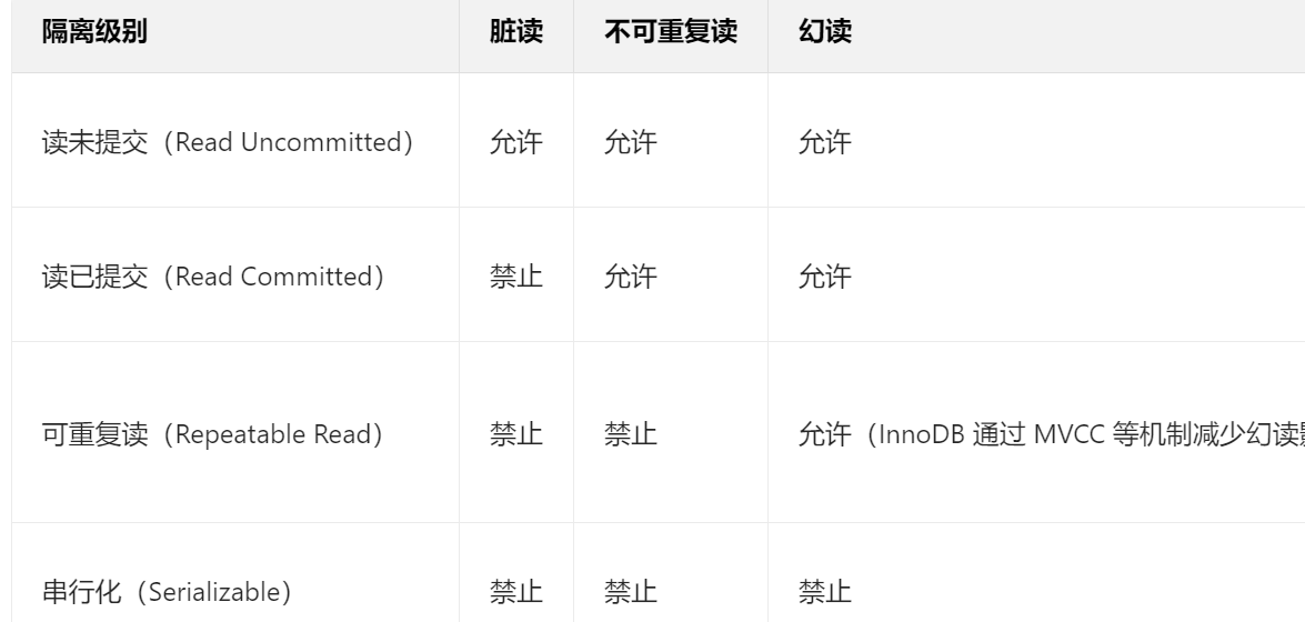 - 幻读:一个事务内多次执行同一查询(通常是范围查询),在查询过程中,其他事务插入了符合查询条件的新数据,导致前后查询结果的记录数不一致。