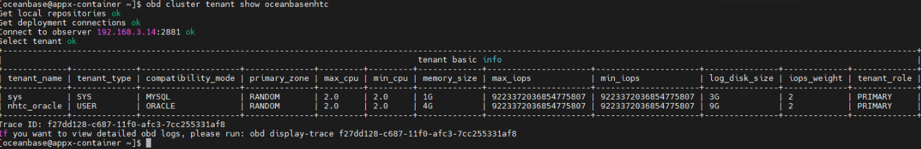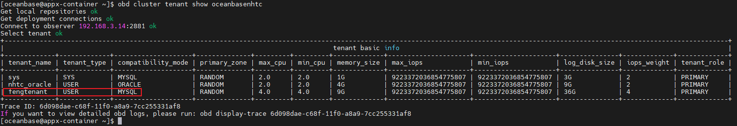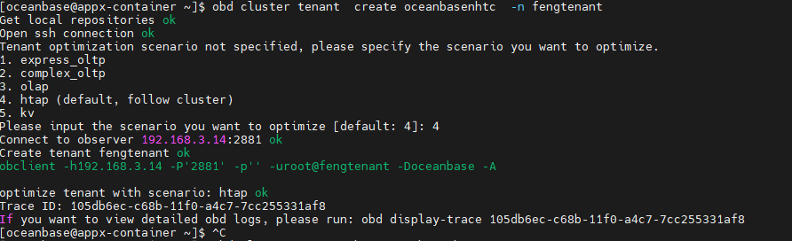 obd cluster tenant create oceanbasenhtc -n fengtenant