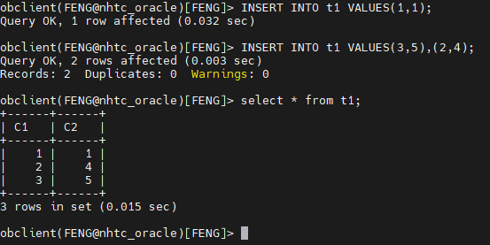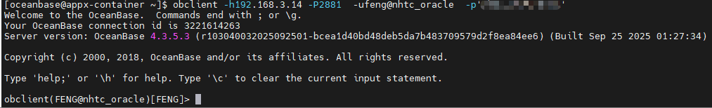 obclient -h192.168.3.14 -P2881 -ufeng@nhtc_oracle -p'xxx'