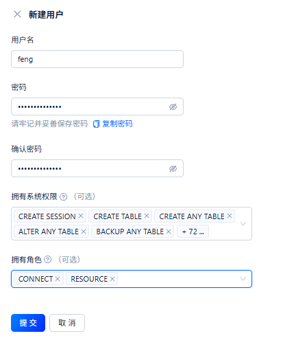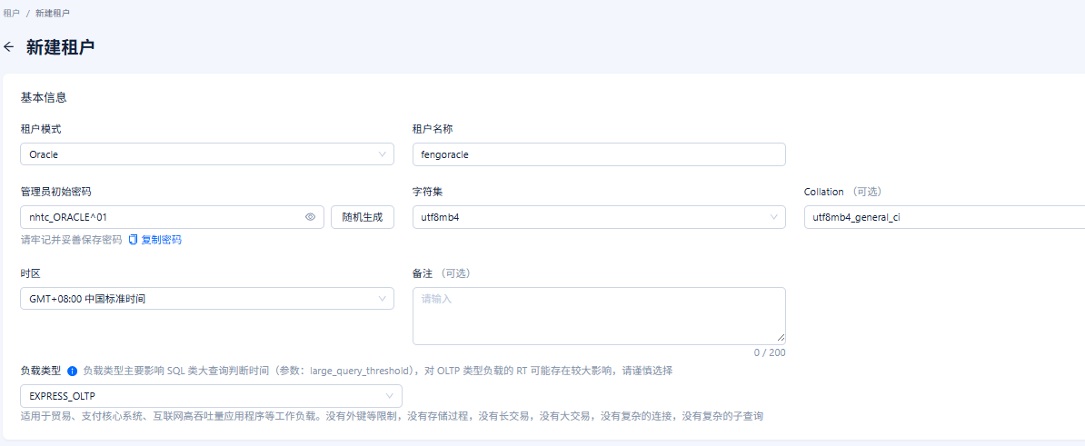输入 租户模式、租户名称fengoracle、管理员初始密码,字符集、负载类型,