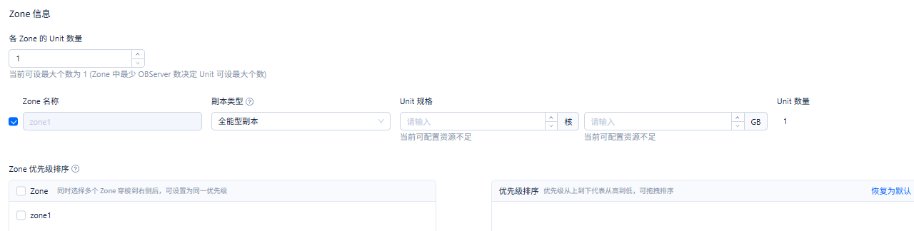 单节点的集群环境,只能创建单副本的租户。如果集群有 3 个节点,ZONE_LIST 值应该为('zone1','zone2','zone3'),PRIMARY_ZONE 则填写 'zone1;zone2;zone3',表示租户的 Leader 优先分布在 zone1,其次为 zone2。