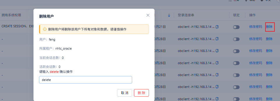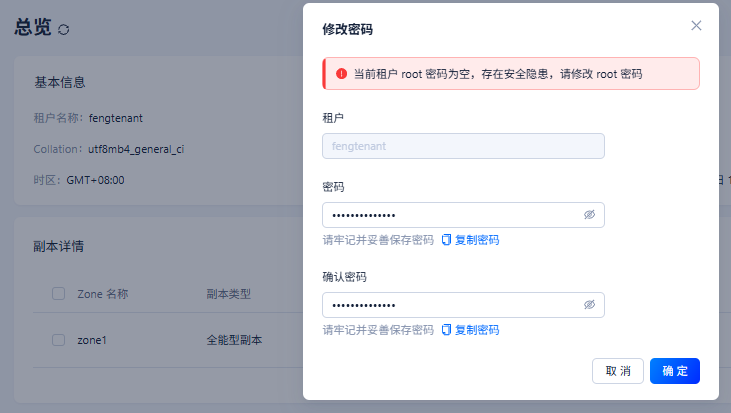 说明: 默认创建完租户后该租户对应的 Root用户密码为空,生产环境建议及时调整密码,登录到对应的用户租户下