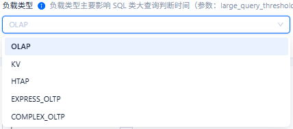 负载类型主要影响 SQL 类大查询判断时间(参数:large_query_threshold),对 OLTP 类型负载的 RT 可能存在较大影响,请谨慎选择。