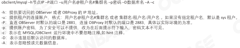obclient/mysql -h节点IP -P端口 -u用户名@租户名#集群名 -p密码 -D数据库名 -A-c