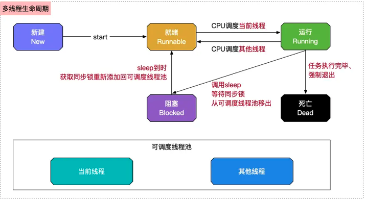 如图所示,多线程的生命周期:新建-就绪-运行-阻塞-死亡。