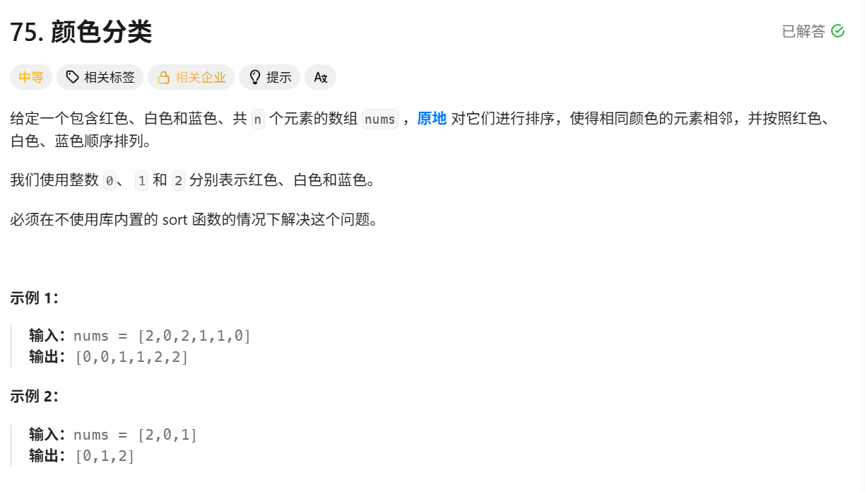 不用sort函数完成对nums数组的排序,数组中只有 0、1、2 三种类型的数字