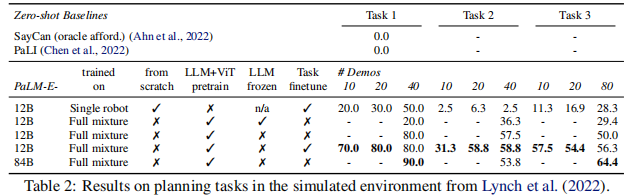 - 少样本泛化能力突出:仅 10 个演示样本时,全混合数据训练的 PaLM-E-12B 任务成功率达 57.5%,远超单机器人数据训练的 6.3%。