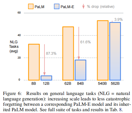 - 小模型(PaLM-E-12B):NLG 任务性能相对 PaLM-8B 下降 87.3%,遗忘严重。