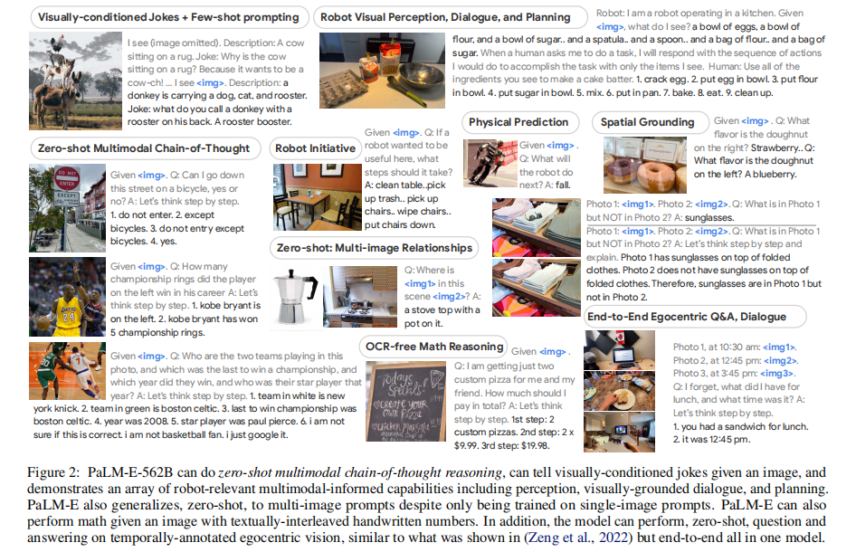 - 涌现能力:PaLM-E-562B 展现零样本多模态思维链(CoT)推理、多图像对比推理、无 OCR 数学推理等能力,尽管仅训练单图像样本(图 2)。