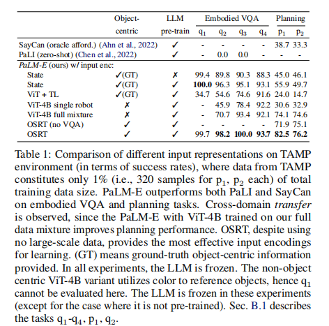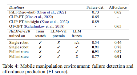 - affordance 预测与故障检测:PaLM-E-12B 全混合训练版本 F1 分数达 0.87-0.91,远超 PaLI(零样本 0.62-0.73)与 CLIP 微调模型(0.65-0.89)。