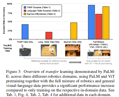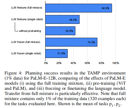 - 预训练 LLM 与多数据混合训练显著提升性能:ViT-4B + 全混合数据的 PaLM-E 规划成功率达 74.6%,远超单机器人数据训练的 32.9%。