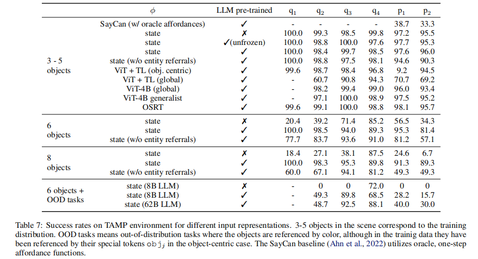 - 基线模型表现不佳:零样本 PaLI 无法完成规划任务,SayCan( oracle affordance)规划成功率仅 33.3%-38.7%,且泛化能力差。