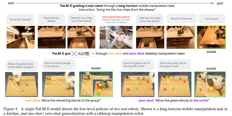 - 闭环迭代:机器人执行动作后获取新的场景观测,重新输入 PaLM-E 生成下一步指令,形成 "观测 - 规划 - 执行" 闭环,支持故障检测与重新规划(如物体抓取失败后调整策略)。