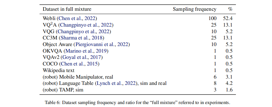 - 互联网规模视觉 - 语言数据(占比≈89%):WebLI、CC3M、VQAv2、OK-VQA、COCO 等,提供通用视觉 - 语言知识。