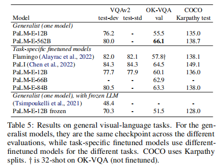 - OK-VQA 任务:PaLM-E-562B 以 66.1% 的成绩刷新 SOTA,超过专门微调的 PaLI(64.5%),无需任务特定微调。