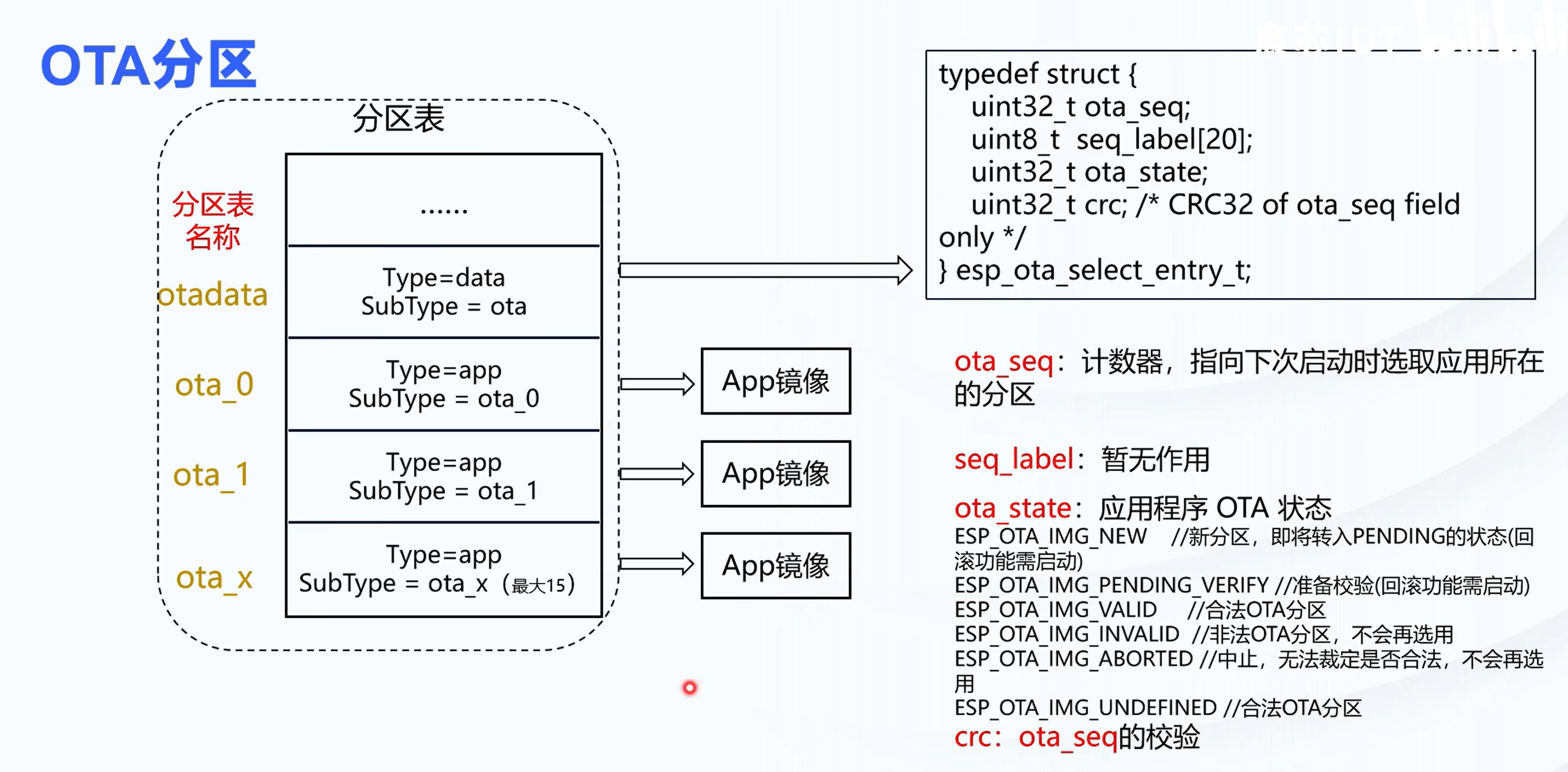 esp_ota_img_states_t state; // 存储当前固件的状态(如:待验证、有效、无效等)