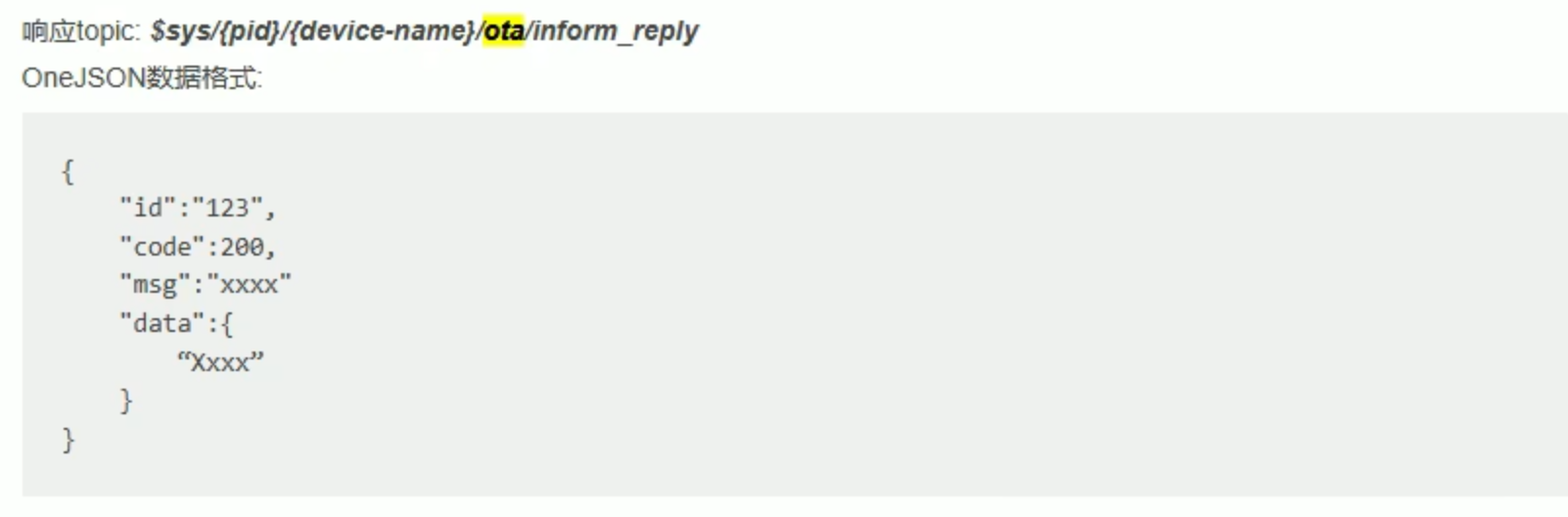 这个是我们收到OneNet平台的升级通知后,设备进行应答回复的消息格式