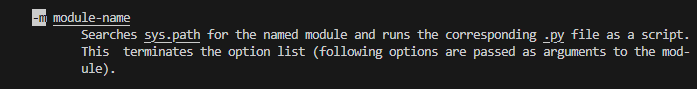 -m module_name开始,后面的所有命令行参数都不再被 Python 解释器当作选项,而是全部传递给这个模块本身 ,也就是说,-m将是 Python 解释器的最后一个选项 ,之后的内容都是给模块用的 命令行参数,作为sys.argv[1:]传给该模块