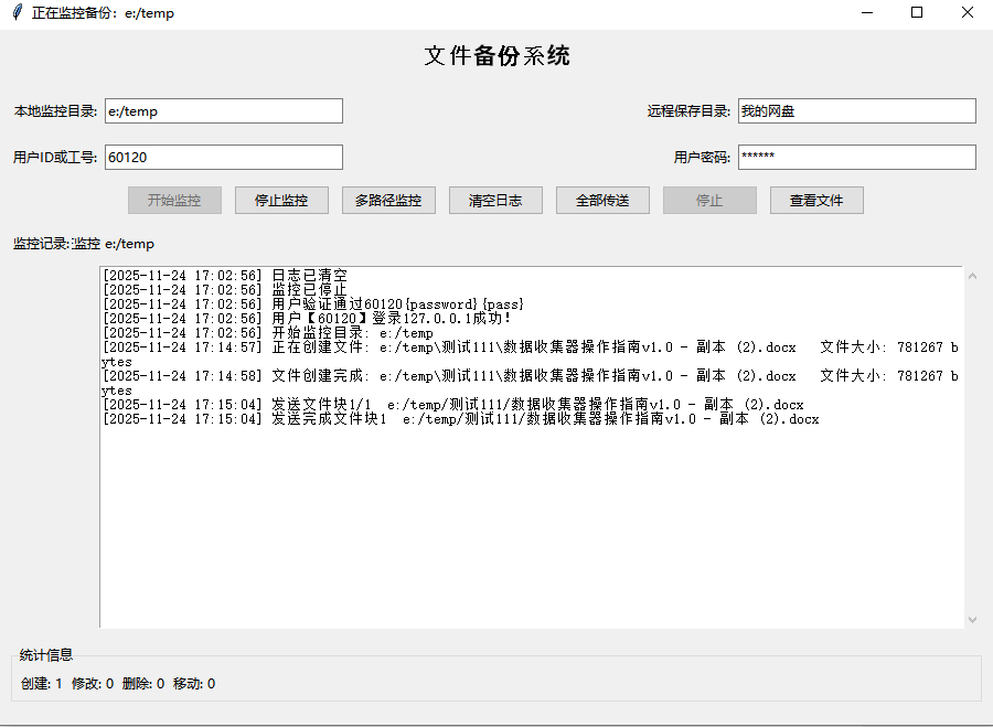 早些时间领导一直想弄个内部网盘,用纯web形式做了一个,但是文件上传,还是的手动操作上传到文件夹。这段时间无意中发现python有个watchdog库,可以用于监控文件系统的变化。它可以检测文件的新增、修改、删除等事件。找AI写个简单DEMO试了一下,发现可行,占用CPU也是极低的,鉴于python编译成exe很方便在桌面端运行,资源库也很丰富,决定用python做个我想要的个人电脑网盘程序,而且可以用于服务器文件自动备份。各种功能实现模块代码块全部找AI问,然后再自己拼。经历了一段时间拼接,终于基本满意了。实现了以下效果: