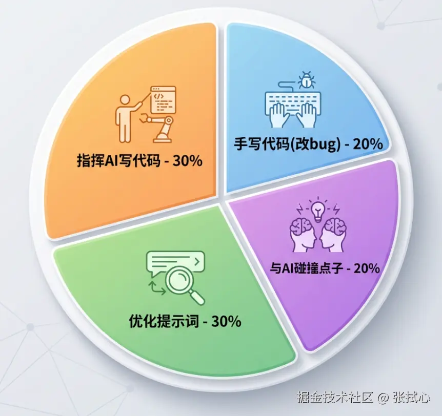 工作时间分配上,也从之前的「大部分时间手写代码」变成了: