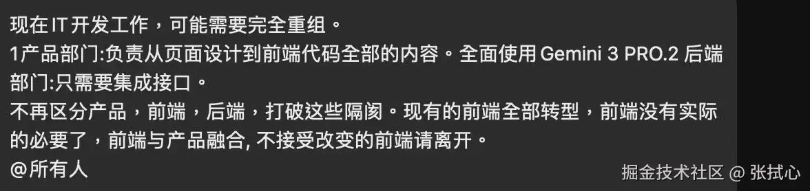 今天被一张《IT 开发工作可能要完全重组》的图片刷屏,图片中的观点是:传统的「产品-设计-前端/后端」模式在 AI 时代将被变革。