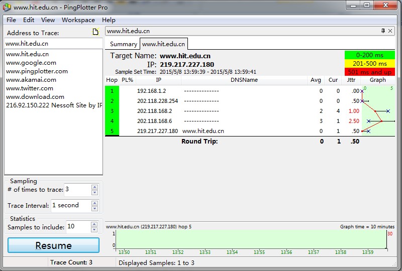 - 启动pingplotter并"Address to Trace Window"域中输入目的地址。在"# of times to Trace"域中输入"3",这样就不过采集过多的数据。