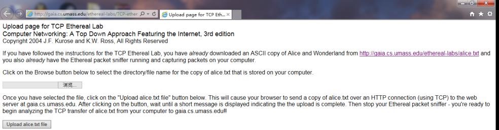 4.在浏览器中,单击"Upload alice.txt file"按钮,将文件上传到 gaia.cs.umass.edu服务器,一旦文件上传完毕,一个简短的贺词信息将显示在你的浏览器窗口中。