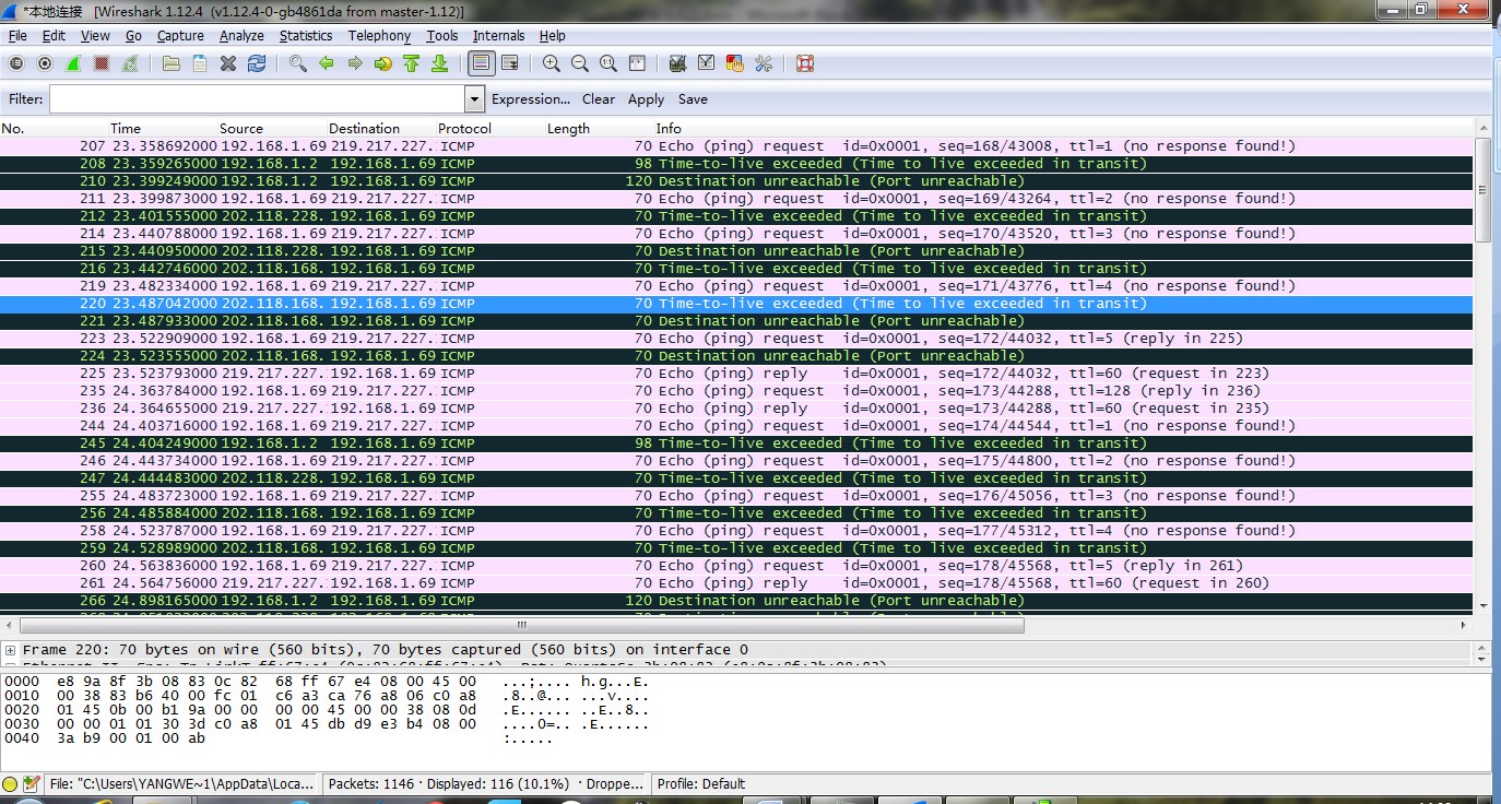 - 停止 Wireshark 的分组捕获。注:如无法访问可与实验 TA 联系,下载已有的 ip-Wireshark-trace 文件,利用该文件进行 IP 协议分析