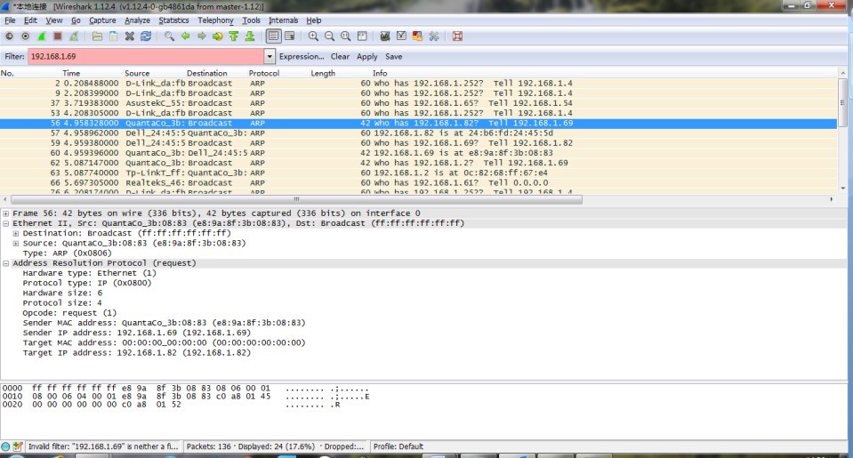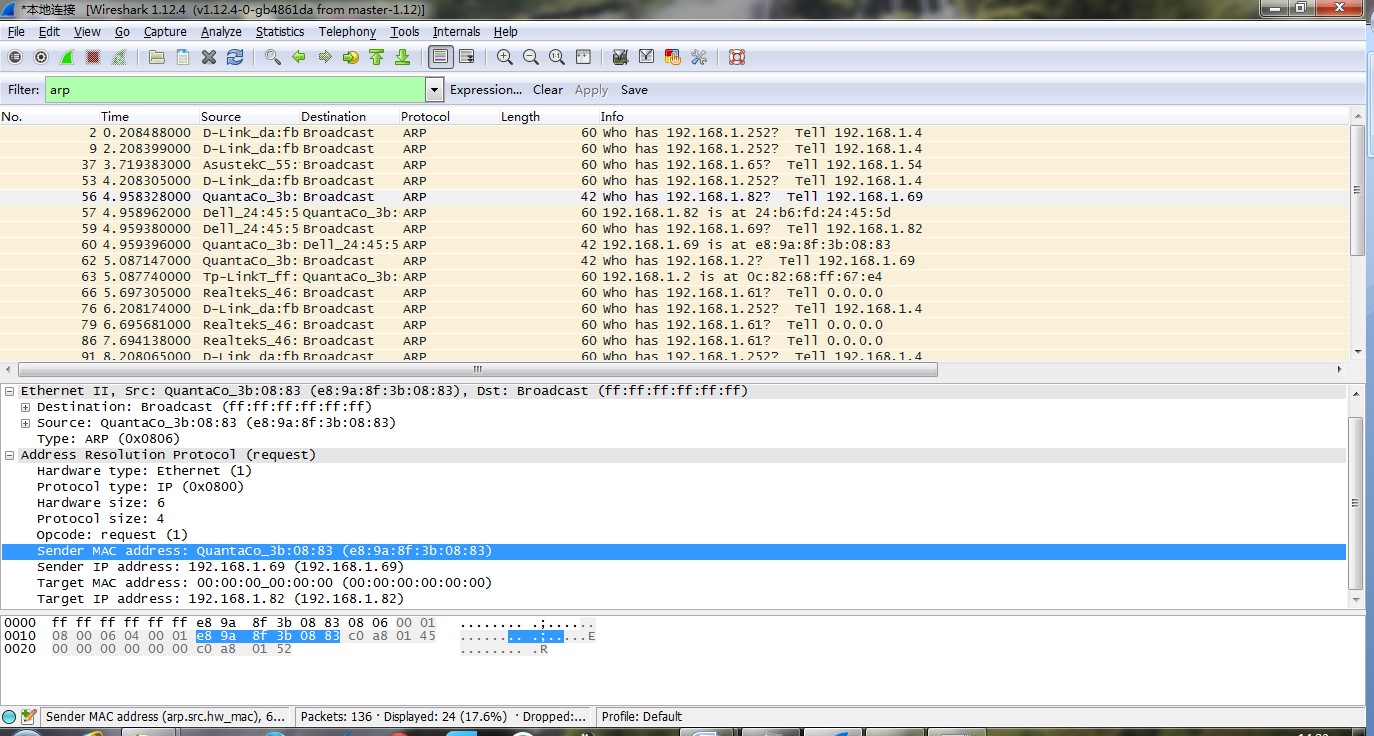 从上图中我们了解到判断一个 ARP 分组是 ARP 请求还是应答的字段是"OP",当其值为 0×0001 时是请求,为 0×0002 时是应答。如下两图:
