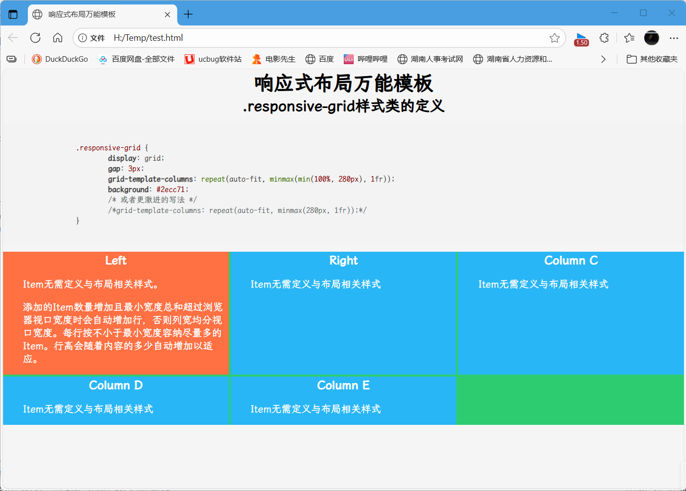 在这种布局里,拉动浏览器窗体边框以改变其宽度,可以看到各Item的宽度的变化以及行列数与浏览器视口宽度的自适应变化。此布局示例的HTML代码如下: