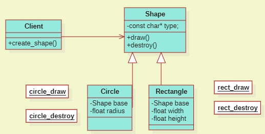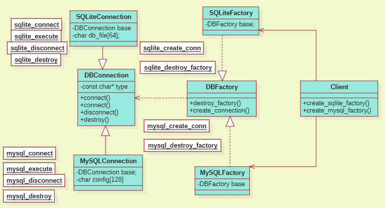 C 语言通过结构体封装对象与工厂 +函数指针定义创建接口实现模式,核心分为两类: