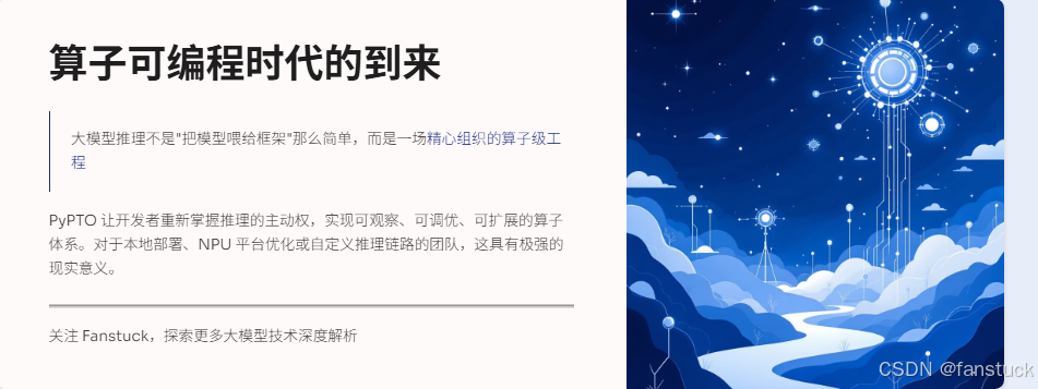 PyPTO(Python-based PTO Operator)正是这样一个容易被忽视、但在大型模型推理链路中极其关键的角色。它既不是简单的 PyTorch 包装层,也不是某种为特定硬件而写的 kernel glue,相反,PyPTO 更像是一个"介于框架与硬件之间的软垫层",负责把模型中的关键计算步骤、特定结构(例如 DeepSeek 的 Sparse Attention、MoE Experts 调度、长上下文 KV 缓存策略)精确而高效地映射到目标设备上。对于 GPU,如 CUDA;对于 NPU,则是 CANN、AscendC;对于多节点系统,则必须进一步考虑通信拓扑与算子调度策略。
