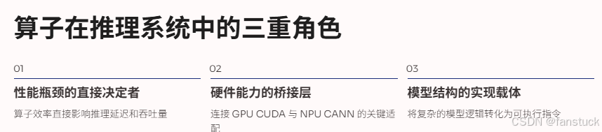 在推理框架(如 PyTorch、vLLM、AscendC Runtime、Megatron、CANN Runtime)之下,真正执行矩阵乘法、attention、softmax、路由、KV 管理等工作的,是算子。算子就像一个个"小型程序单元",专门负责某一类数学计算或数据处理操作。