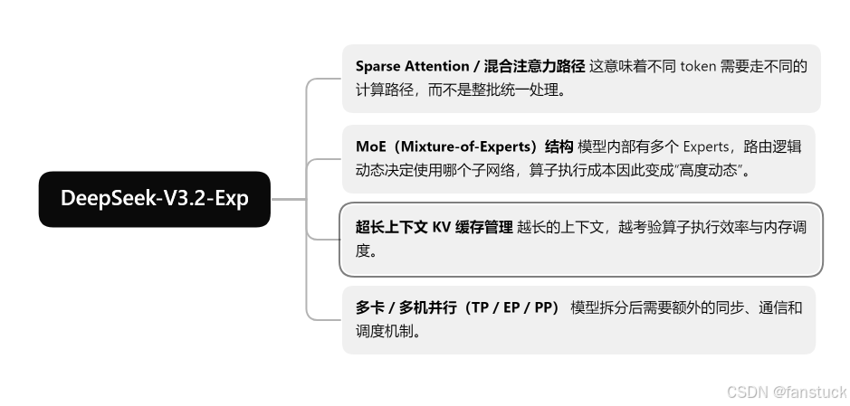 DeepSeek-V3.2-Exp 系列模型本身已经不是"搭个 transformer、堆点层数"这么简单的结构,而是集成了大量面向性能和长上下文的复杂机制,比如: