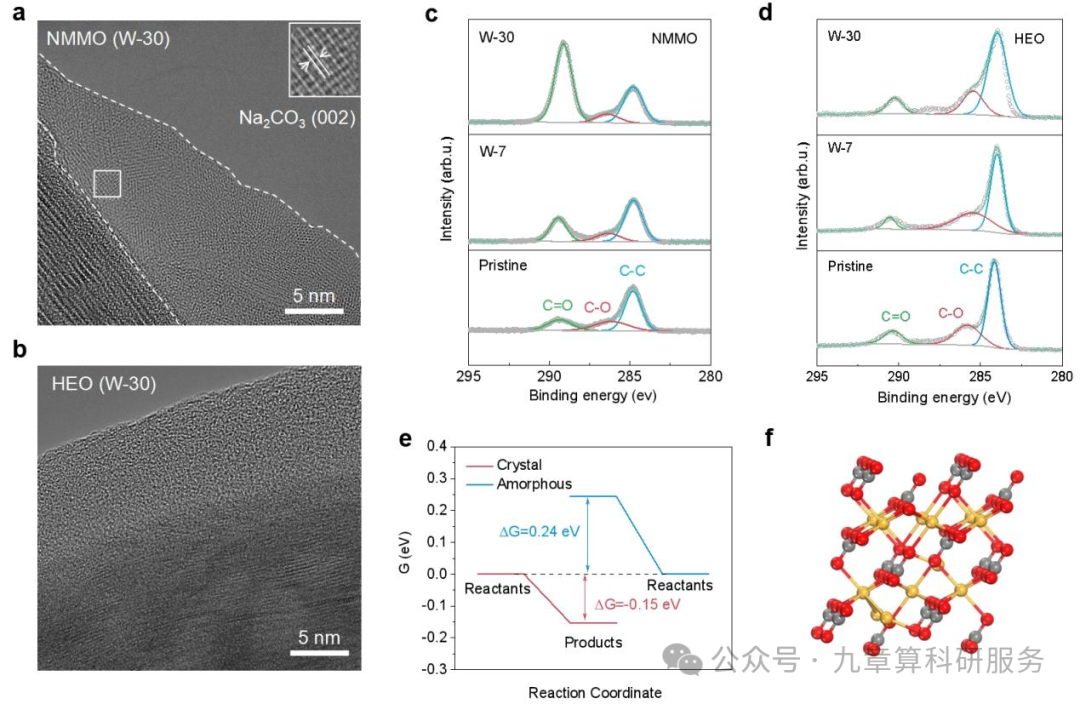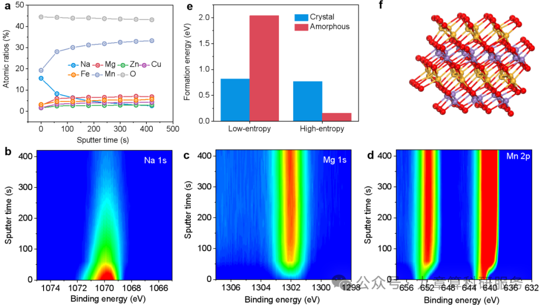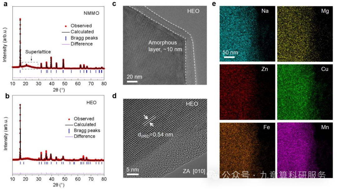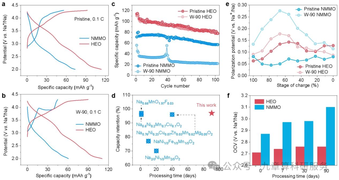 本研究提出一种高熵工程策略,设计合成Na0.8Mg0.1Zn0.1Cu0.1Fe0.1Mn0.6O2高熵氧化物正极。该材料在热力学驱动下自发形成厚度约10 nm的非晶表面层,其形成能仅为0.16 eV。该非晶层作为动力学屏障,将H2O/O2反应的活化能提升160%,显著抑制表面腐蚀与钠损失。经90天水浸后,HEO仍保持98%初始容量,循环100次后容量保持率达99%,优于现有层状正极材料。