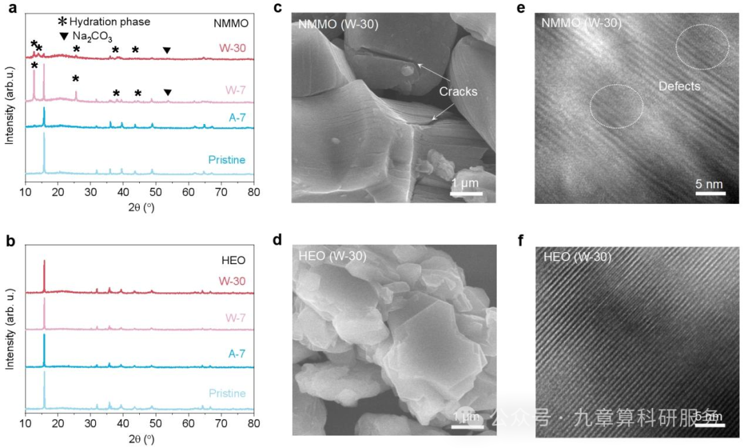 水浸后HEO结构稳定,无Na2CO3或水合相生成,而NMMO出现明显结构破坏与副产物。