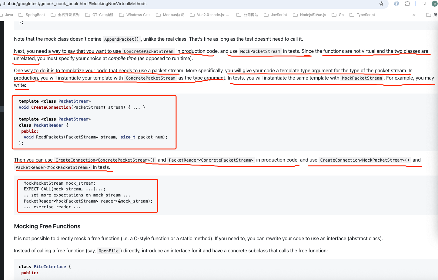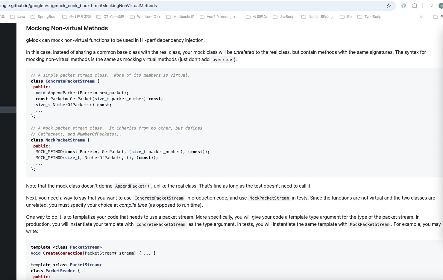 最近在实际工作中,基于C++ GoogleTest测试框架时,发现在针对某个类的非虚函数进行Mock时,由于之前的类都写好了,不方便针对原来的类重构,即不方便侵入式修改原有类的代码,并且要针对写UT的函数接口没有使用virtual关键字进行声明,发现GMock提供的示例程序基本上都是针对virtual虚函数的。如果对类的非virtual虚函数进行Mock,Google官方给了一个类模版参数的实现方法,具体可以参考Mocking Non-virtual Methods,如下图所示: