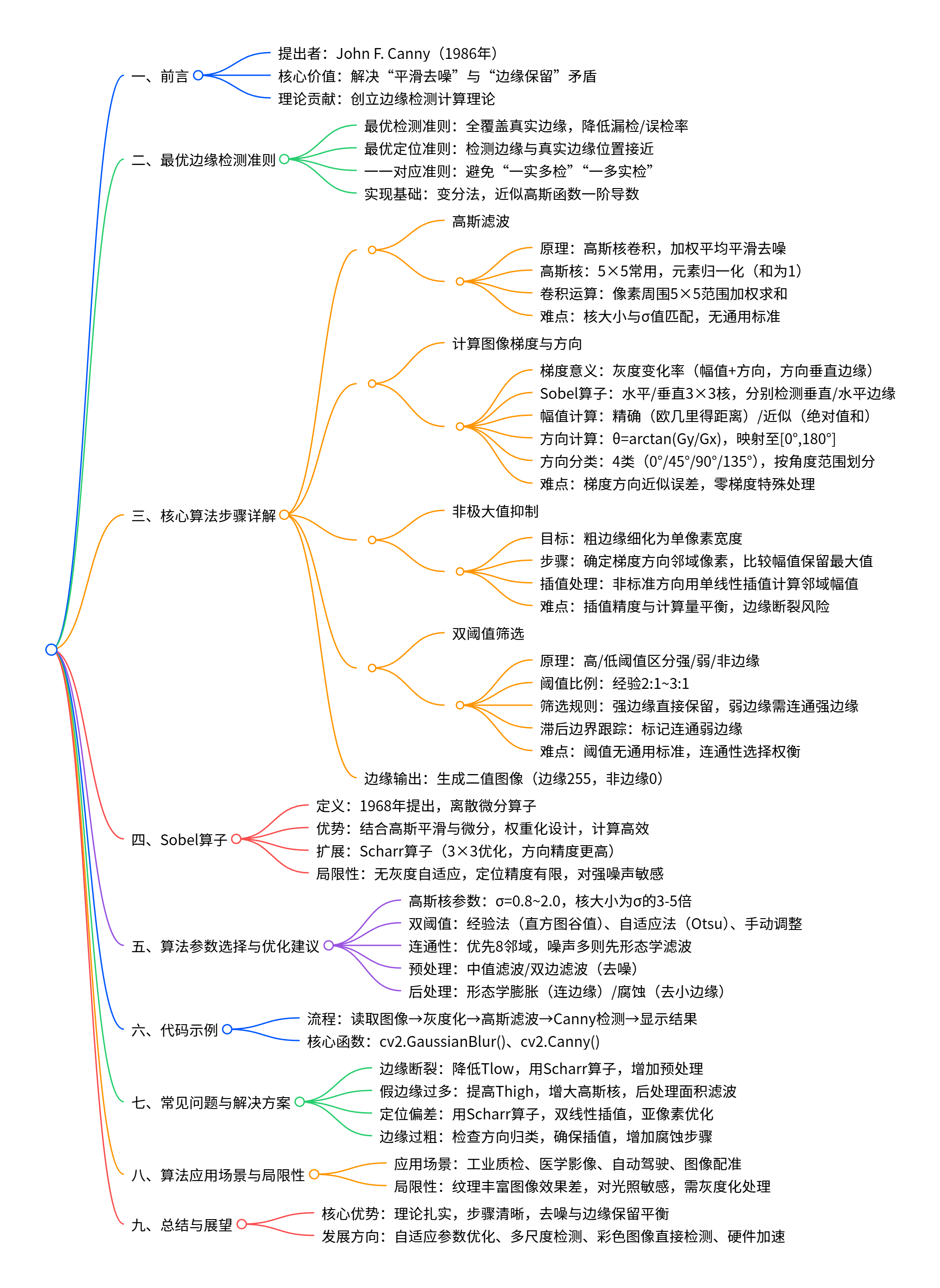 Canny边缘检测算法凭借其"最优边缘检测"的理论基础、清晰的步骤设计和优异的实践性能,成为计算机视觉领域的经典算法。其核心价值在于:通过高斯滤波、梯度计算、非极大值抑制、双阈值筛选的有机结合,在去噪与边缘保留之间取得了平衡,为后续高级视觉任务提供了高质量的边缘特征。
