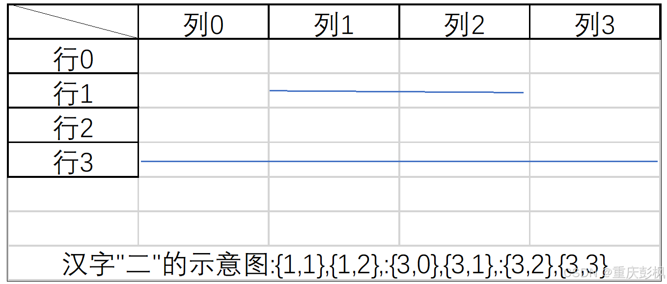 上图:汉字"二",表示为{1,1},{1,2},{3,0},{3,1},{3,2},{3,3}.一个字是n个二维点坐标.char zifu[n][2].