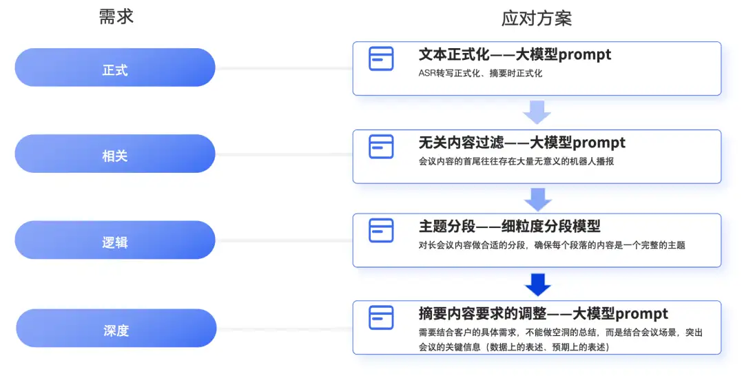 明确用户需求的各个要点,给出算法应对方案。具体以摘要任务为例,能力标准化过程包括大模型prompt实现文本正式化、过滤无关内容、利用细粒度分段模型进行主题分段以及调整摘要内容要求等。