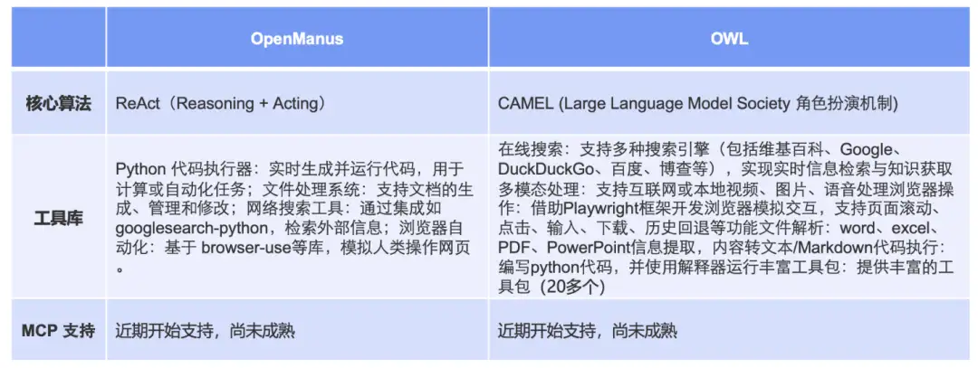 - 快速部署首选:OWL综合效果(GAIAbenchmark排名第一)排名第一,有丰富的工具库,涵盖了在线搜索、多模态处理、浏览器操作、文件解析、代码执行等多种能力,成为快速上手的理想选择;