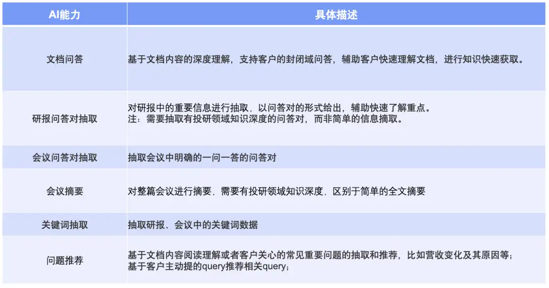 为满足这些需求,项目首先对涉及到AI算法的部分拆分为6个能力:文档问答、研报问答对抽取、会议问答对抽取、会议摘要、关键词抽取、问题推荐。