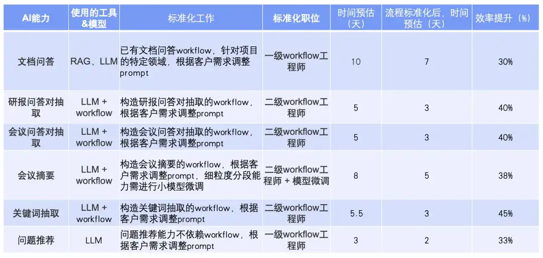 从时效性预估来看,标准化流程后各项能力的交付时间显著缩短,效率大幅提升,如研报问答对抽取时间从5天缩短到3天,效率提升40%。