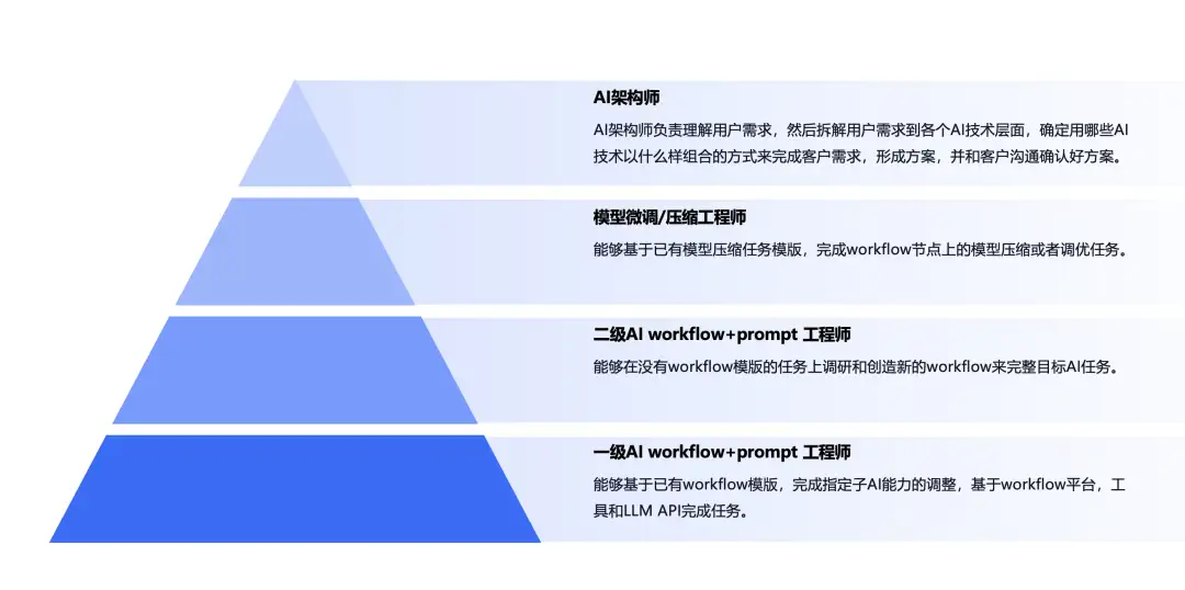 - 如果客户有降本的需求,例如大模型成本高,想换成小一点的大模型,且需要有一定的效果,即对应模型压缩/微调工程师(这块目前还没有从data->model效果迭代标准化比较好的工具)