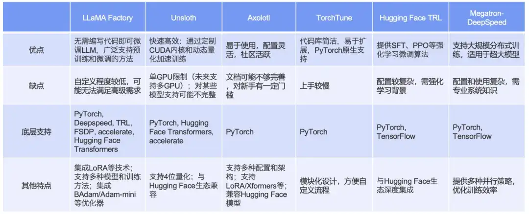 - LLaMAFactory是一个集大成者,支持预训练、SFT和强化学习训练,集成了LoRA、Adam-mini等多种流行技术,新出现的算法也能快速支持,支持模型广泛。