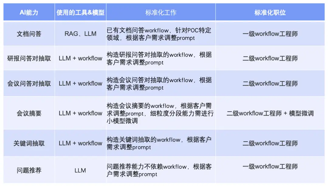 交付流程从明确客户需求开始,依次进行任务分配、需求拆解、AI能力搭建和模型能力优化。不同层级的工程师在交付体系中各司其职: